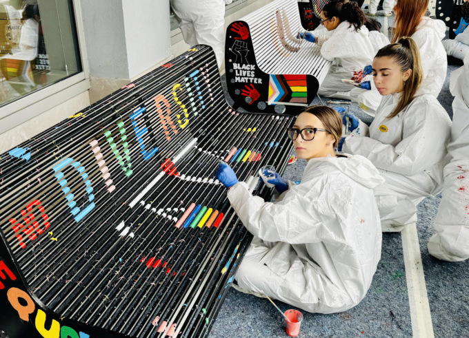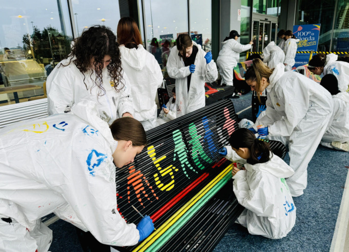 Per una settimana, cinquantuno studenti dell’Istituto d’Arte Kandinsky di Milano si sono allontanati dalle aule scolastiche per mettersi all’opera direttamente sul campo. Otto panchine grigie, situate nelle zone esterne del Fiordaliso, sono diventate le loro tele, pronte ad accogliere pennellate di colore, creatività e significato. Con una tavolozza ricca di coloratissimi smalti, gli studenti hanno dato forma a un’esplosione di vivacità e cromatismi che ora caratterizzano l’arredo urbano del centro commerciale, trasformandolo in uno spazio di condivisione e riflessione sulla convivenza e sul rispetto reciproco.