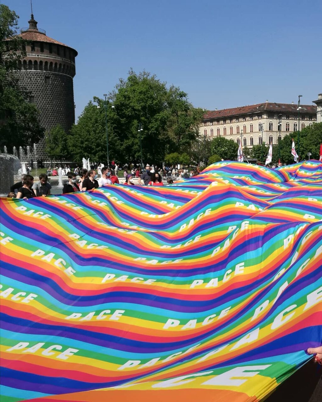 Un bandierone lungo 25 metri e composto da tante piccole bandiere della Pace. E’ stato questo il simbolo principale della manifestazione statica che si è svolta ieri, domenica 25 aprile 2021, a Milano davanti al Castello Sforzesco, in occasione dell’anniversario della Liberazione italiana dal regime fascista e dall’occupazione nazista durante la Seconda guerra mondiale.