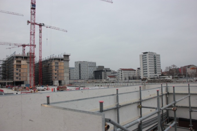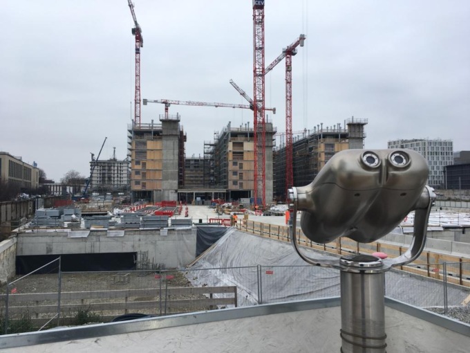 Da lì attraverso uno stretto corridoio coperto di pannelli che descrivono come sarà la zona nel prossimo futuro e salendo poi una rapa di scale, si arriva allo spazio con vista sul cantiere, con tanto di maxi binocolo a disposizione dei visitatori.