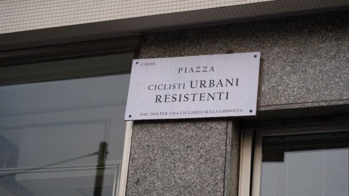 Durante la manifestazione è stata anche affissa una nuova targa per piazza Lugano: ‘Piazza Ciclisti Urbani Resistenti, dal 2018 per una ciclabile sulla Ghisolfa’.