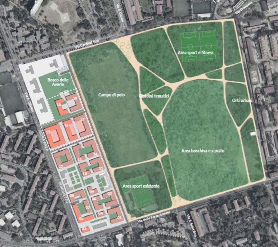 Verranno realizzate case a canone calmierato, molte destinate a dipendenti pubblici, e l’80% dell’area diventerà un parco accessibile a cittadine e cittadini. Il ‘Bosco delle averle’ sarà salvaguardato, mentre la volumetria è stata ridotta da 144mila mq a 122mila mq, a tutela del quartiere e della sostenibilità complessiva dell’intervento, nel rispetto dei Provvedimenti di vincolo della Soprintendenza Archeologia, Belle arti e Paesaggio”.