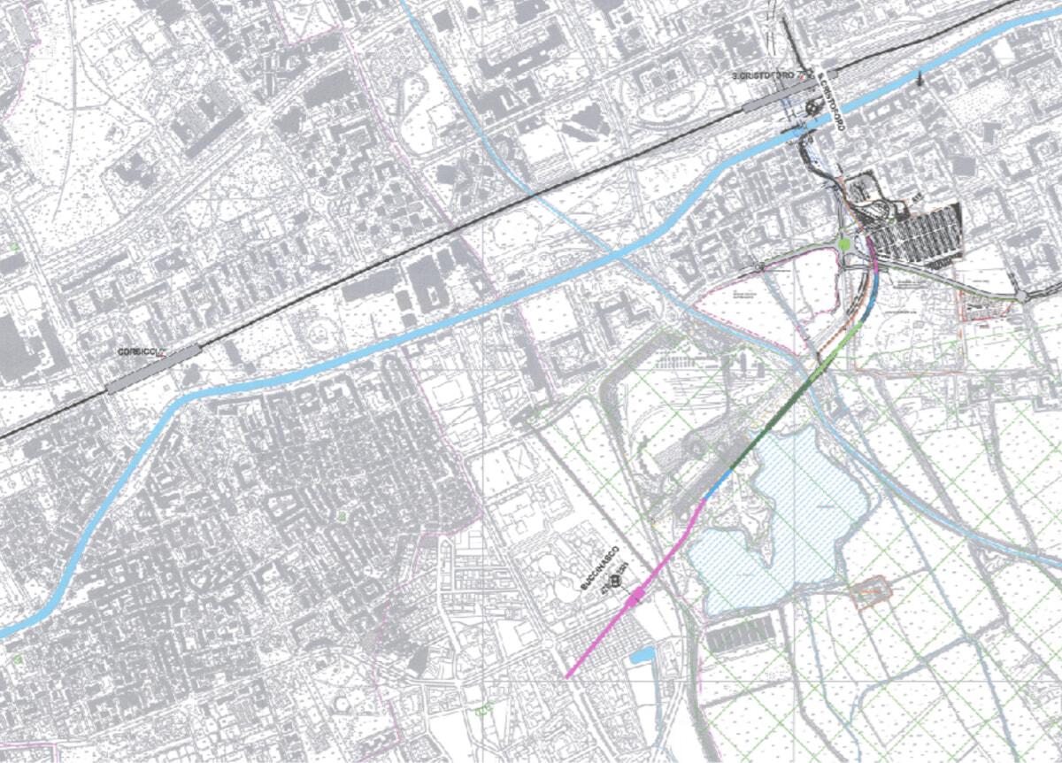 Un’altra ipotesi, più estesa (4,1 km per 410 milioni di euro), includeva tre fermate – Buccinasco Est, Buccinasco Lario e Corsico Cervi – per servire anche il territorio corsichese. Il vantaggio sarebbe stato un accesso più rapido alla metropolitana per i residenti di Corsico, ma senza un ampliamento reale del bacino d’utenza rispetto alla prima opzione, a fronte di costi molto più elevati.