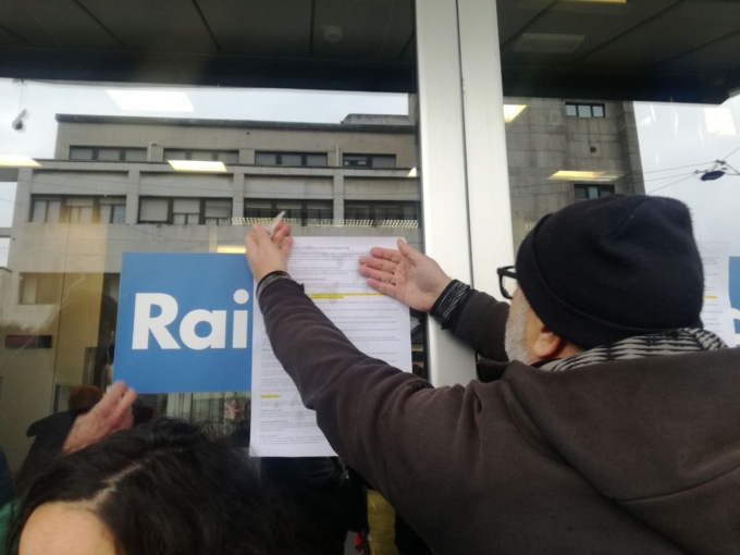 Si sono poi incollati all’ingresso principale della sede Rai di Milano e, salendo sul tettuccio dell’edificio, hanno affisso uno striscione che cita “DiRai la verità”. Tutto questo mentre altre persone bloccavano la strada. E ancora: alcuni barattoli di vernice verde sono infine stati gettati sulla scalinata e su vetri e parete frontali dell’ingresso.
