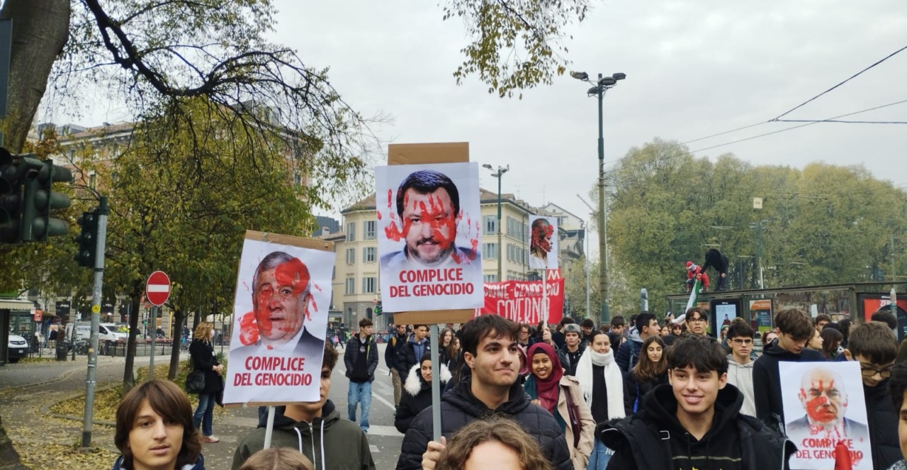 La mattinata è stata scandita da una serie di performance e gesti dimostrativi. Dopo il ritrovo alle 9 in largo Cairoli, alcuni giovani hanno esposto una grande bandiera palestinese ai piedi della statua di Vittorio Emanuele. Infatti secondo Jessica Stefanini, coordinatrice dell’UdS Milano ”E inaccettabile che il nostro Stato e il nostro governo continuino a collaborare con l’entità sionista. Chiediamo l’annullamento di ogni rapporto economico con Israele e che il nostro governo condanni il genocidio del popolo palestinese”. Subito dietro, lo striscione d’apertura recitava: «Contro la scuola dei padroni. Stop genocidio, repressione e riforma Valditara».