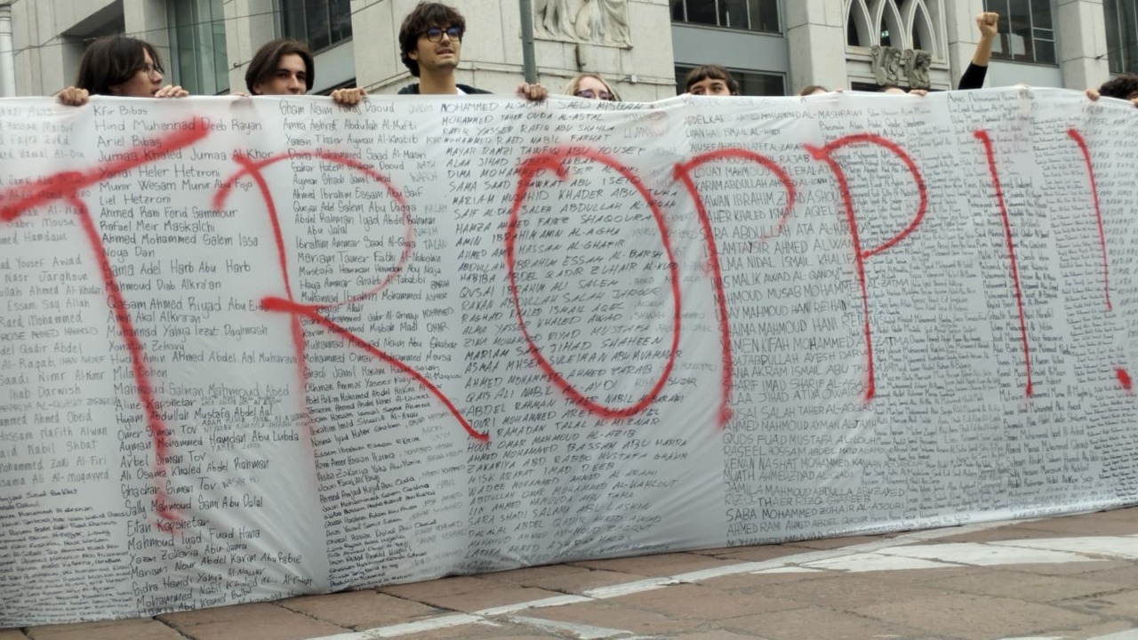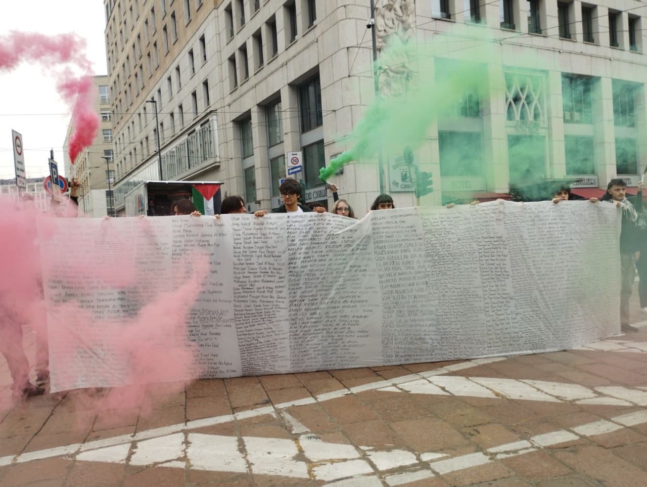 Si è svolto anche un blitz davanti alla sede di Assolombarda in via Pantano. “L’obiettivo è di denunciare il genocidio del popolo palestinese. Sullo striscione sono scritti i nomi di alcuni dei tantissimi bambini palestinesi uccisi da Israele, dei quali per 5 minuti ne abbiamo letto i nomi: Troppi!” — continua Riccardo Bevilacqua, responsabile della comunicazione dell’Unione degli studenti di Milano — .