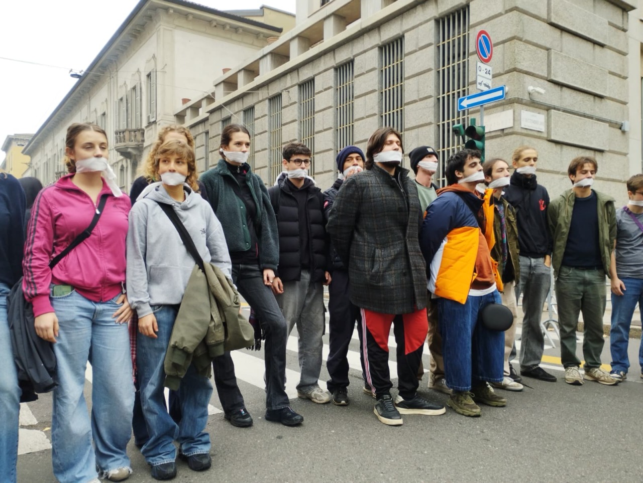 “Ci siamo imbavagliati davanti alla Prefettura perché riteniamo inaccettabile la repressione messa in atto nell’ultimo periodo” — afferma Ruggero Cima, membro dell’assemblea dell’Unione degli Studenti Milano — “Non possiamo rimanere zitti quando la nostra voce viene continuamente silenziata e le nostre scuole cadono a pezzi. E’ questo il motivo per cui abbiamo chiuso l’entrata di Città Metropolitana con lo scotch da cantiere”. Poco prima adavanti a Palazzo Isimbardi, sede della Città Metropolitana, le transenne sono state avvolte nel nastro adesivo come gesto simbolico contro “un governo che ci vuole impauriti e sottomessi ai suoi programmi”, ha dichiarato una rappresentante al megafono.